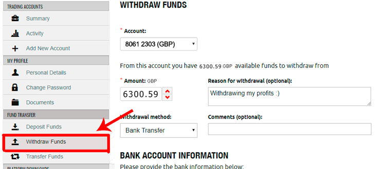 As you can see from the screenshot below, I decided to use the 'withdraw funds' function to withdraw £6,300.59 from my account.